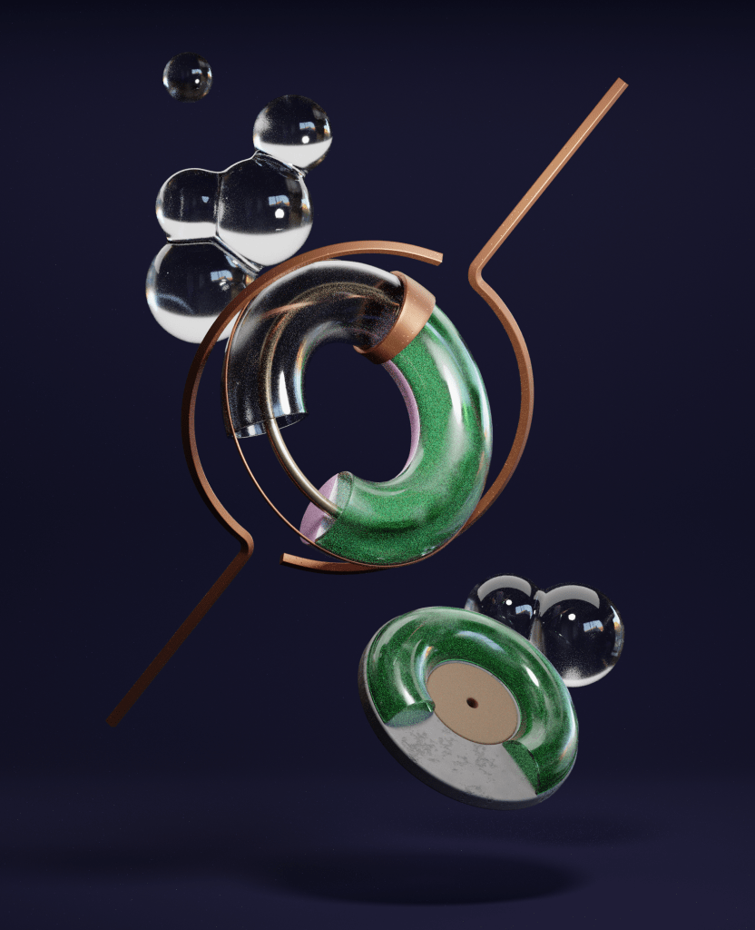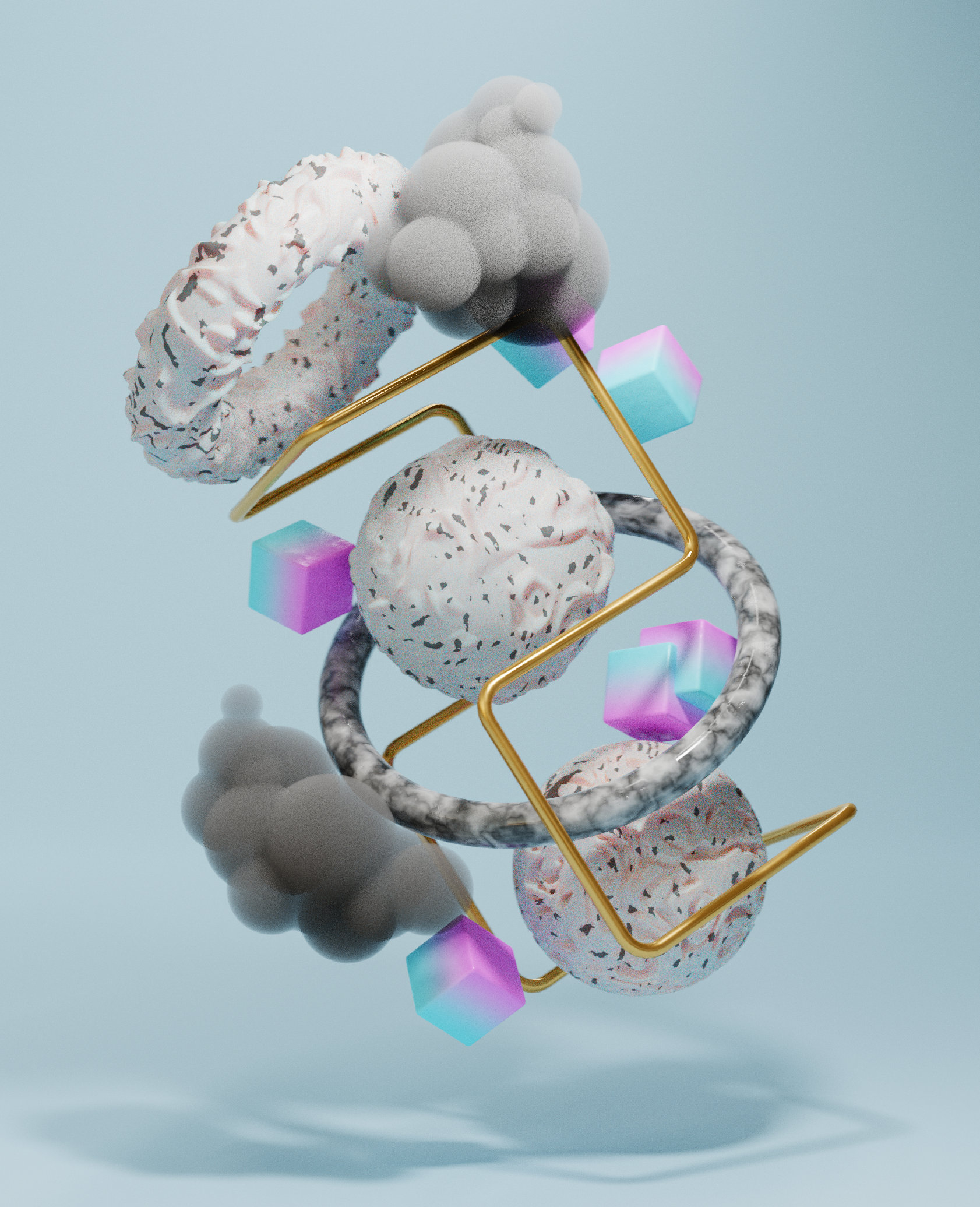 This is a series of abstract scenes I made to practice composition and materials in 3D. I played around with different textures, from smooth metal to soft clouds and almost edible-looking surfaces, to see how they interact. The floating elements and gold structure create a sense of movement while keeping everything balanced. It was a fun way to experiment with shapes and contrasts, making something abstract that still feels carefully arranged.